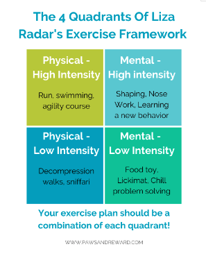 Think of the four quadrants as having two axes: low and high intensity as well as physical and mental. So you can have low physical, high physical, low mental and high mental enrichment activities.